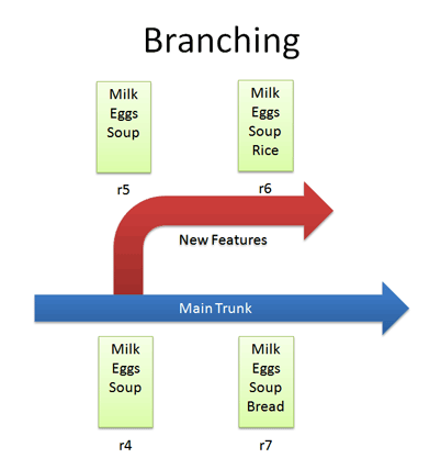 - Let’s say we want to get the “Rice” feature from our experimental branch into the mainline. How would we do this? Diff r6 and r7 and apply that to the main line?Wrongo. We only want to apply the changes that happened in the branch! That means, we diff r5 and r6 and apply that to the main trunk.