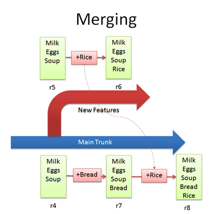 - But what if we add (+Rice) in the diff between r4 and r7? which (+Rice) will be added to r8? will it be from the diff between r4 and r7? or the diff between r5 and r6? This is where “Conflicts” come into picture. We want to avoid conflicts as much as possible. To avoid conflicts, always get the latest version from the trunk before merging it to the main branch. With this, we will be adding the diff between the branch and the latest version of the trunk.