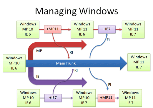 Let’s say we’re at Media Player 10 and IE 6. The Media Player team makes version 11 in their own branch. When it’s ready and tested, there’s a patch from 10 – 11 which is applied to Main (just like the “Rice” example, but a tad more complicated). This a reverse integration, from the branch to the trunk. The IE team can do the same thing.
